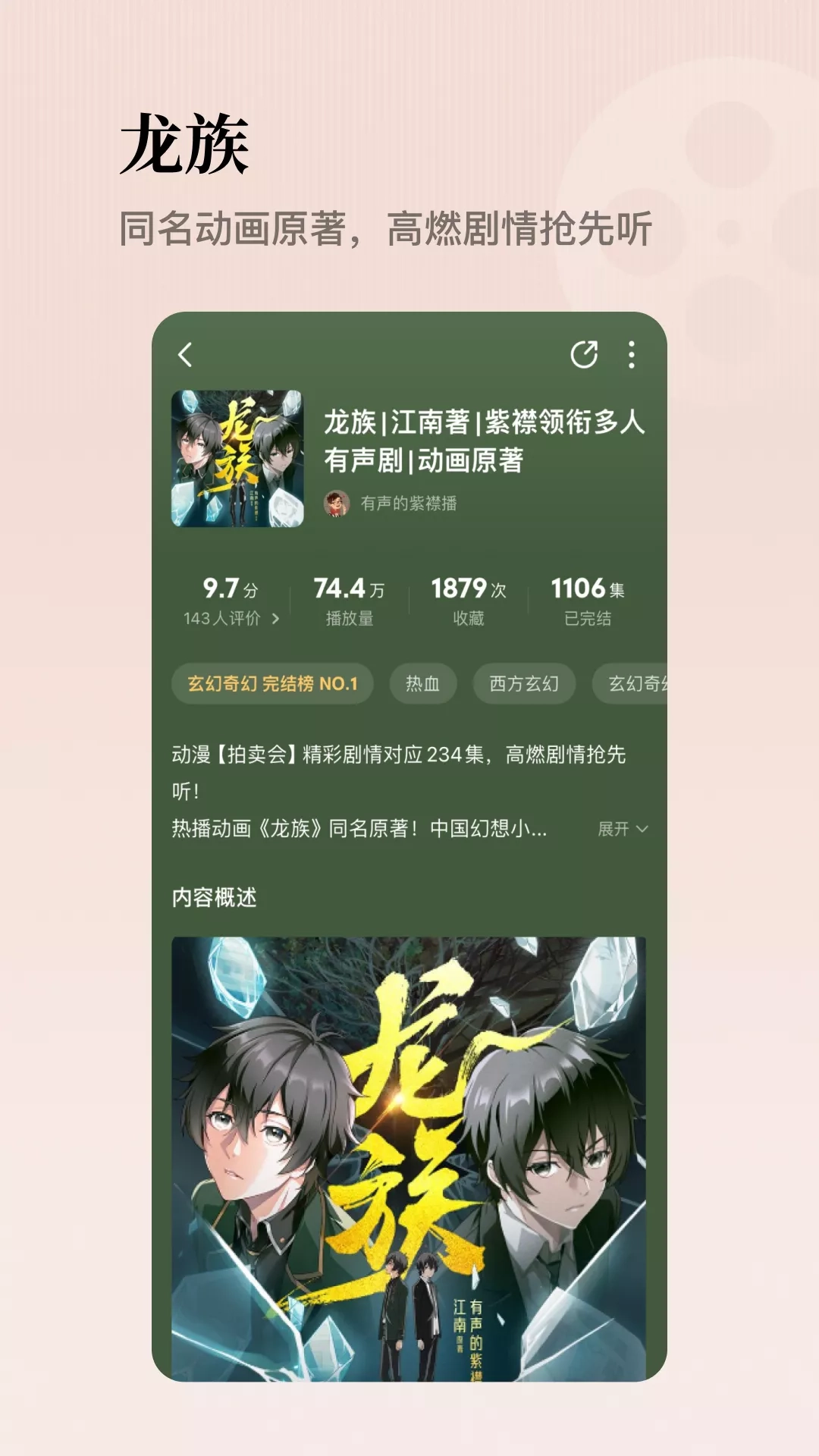 凡人修仙传、国色芳华、淬火年代长安的荔枝、折腰、我叫赵甲第、借命而生、雁回时等经典原著。 燃烧的蜂鸟.时空追凶1990、血孩子、保护我方族长、第一天骄、清朝生活实录、龙魂剑圣、何日请长缨、牧神记、深空彼岸等热门网文出版图书。 【热播影视】 《入青云》:侯明昊、卢昱晓上演燃爽斗爱。冷酷女战神遇上纨绔野心家,“身披马甲”双强博弈,这场互钓游戏,谁先坠入爱河? 《与晋长安》:宋轶、丞磊主演同名电视剧原著,九鹭非香古言力作!飒爽女将军vs 三重身份敌国皇子,宿敌虐恋,三重燃爱! 《重生之女将星》:周也、丞磊主演《锦月如歌》原著,大神千山茶客力作,重生复仇、双强逆袭,夺回属于自己的一切! 《缱绻与决绝》:杨幂、欧豪主演《生万物》原著,人民文学奖获奖作品,乡土中国的时代浮沉录!土地沉默,孕育惊雷! 【霸榜好书】 《万仙来朝》 :萧瑾瑜东方玄幻新作《万仙来朝》爆燃来袭!万仙俯首,唯我独尊!一剑开天门,万族朝圣来!见证至尊崛起之路! 《万剑朝宗》 :名家六道沉沦新作!修为尽废?莫慌,未婚妻来相助。废材铸无上神体,修无敌剑道!诸天神魔跪伏! 《牛奶可乐经济学4》:诺贝尔奖得主索洛力荐!用达尔文之眼破解职场、消费与社会的隐藏逻辑 《大医无疆》:名家石章鱼都市力作!穿越成国医传人,医武双绝破江湖迷局! 《仙者》:忘语经典仙侠作品!逆天改命破苍穹,凡人修仙踏骨行,大道争锋谁主沉浮! 《养气血才能养命》:300万粉丝信赖的中医团队羊爸爸,100+调理方法应对痛经、脱发、失眠等问题。 《仙渊》:晨弈仙侠新作!废材杂役得逆天葫芦,种田崛起破界飞升! 【精彩短剧】 《不在灯火阑珊处》 《余温难续》 《无敌扫地僧》《王爷,你才是替身》《摘下工牌,我惊掉全桌下巴》《隐忍三年,我再世为人》 《后来月亮失约》 【产品功能亮点】 -海量书库-超60万册正版图书,百万小时听书 -精彩短剧-热门爆款短剧任意看。 【福利活动中心】 读书会员、影视热门图书,福利送不停! 【新人福利】新用户海量内容免费看~ 【分类齐全】玄幻、奇幻、科幻、言情、仙侠、都市、出版、历史、悬疑推理、青春校园、女生同人等等~