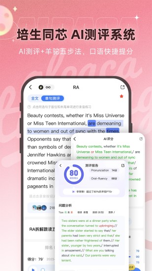 可可英语,年轻人的英语学习软件,五星好评如潮,可以满足您英语听说能力提升、单词背诵等方面学习需求。 『特色亮点』 1、AI口语教练:与智能AI随时随地练口语,多场景+语音打分+语法纠错,告别高价外教。 2、视频精听:多样化的精选视频素材,采用4步法,逐步精听,提升听力水平能力。 3、外刊精读:精选新鲜外刊资讯,主播带你精读看世界,全面提升阅读能力。 4、名著精讲:精选国外原版名著,带你精听细读,感受文化魅力 5、国际音标:48组基础音标讲解和练习+22组易混音标对比训练,音素级智能评测。 6、趣味配音:精选电影、动漫片段,您也可以玩配音当主演,有效记单词和练口语。 『主要功能』 1、海量内容:3000优质英语节目,语音同步双语字幕,超过30万篇有声资源。 2、离线收听:离线收听节省流量,高速批量无限下载,支持短语和句子收藏。 3、听力训练:单句循环反复精听,九宫格游戏练听力,单句听写消灭听力死角。 4、口语跟读:智能实时口语评分,逐句跟读逐词打分,助你攻克“开口”难关。 5、单词背诵:真题例句+词频统计,支持自定义生词本,闯关打卡赚豆换礼品。 『联系方式』 微信公众号:可可英语