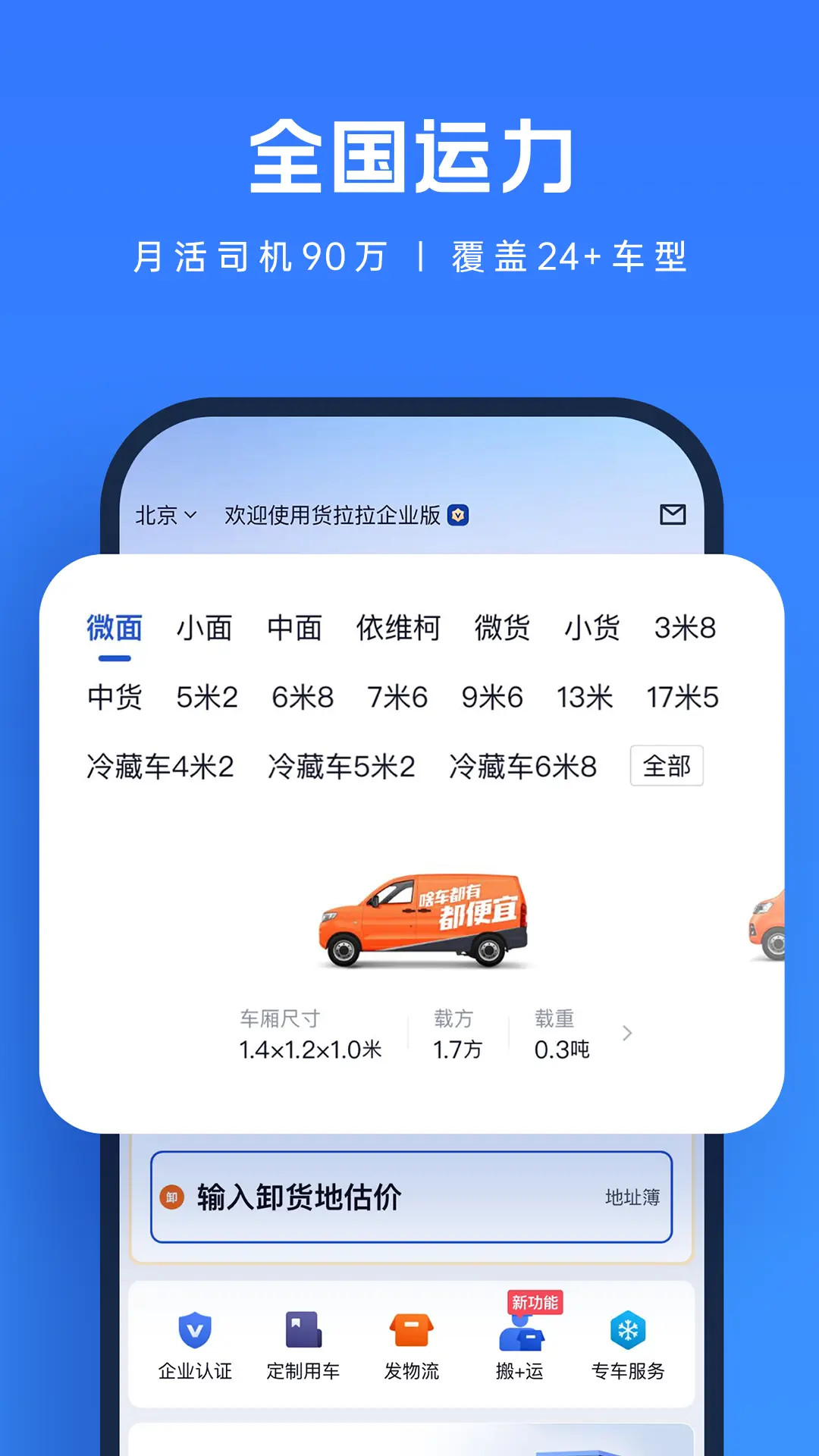 货拉拉企业版,注册企业即送320元组合券,超100万家企业选择的专业货运平台,提供各行企业货运的解决方案。 【满足企业多种货运需求】 同城货运:紧急用车、预约用车、全国用车,一键下单,快速响应,随时随地有车运货 定制城配:提供物流配送、家电配送、零售配送等定制化配送服务,解决企业固定、多点运输等用车需求 【节省企业用车成本】 实时比价:透明标准计价模式,比养车租车节省30%成本 API支持:开放API接口,详细文档轻松接入,减少开发成本 极速开票:提供电子普票、纸质专票申请,线上化流程,统一报销,降低人工成本 【帮助企业高效管理】 账号权限:提供管理员、员工等子母账号管理功能,配有限制费用、监控预算等九大账号权限。 月结账期:30天免息月结,先用车后付款,资金灵活流转 充值支付:企业充值享返点优惠,员工用车快速支付无需报销 【保障企业货运安全】 货物保障:单单免费享5万元货物保障服务,企业货运不忧心 【高标准专业服务】 经三证考核的专业司机,货拉拉平台认证,覆盖全国100+城市,提供专业优质服务 【联系方式】 1.企业版热线:4008783636 2.企业版官网:e.huolala.cn 3.货拉拉企业版微信服务号:huolalaqy