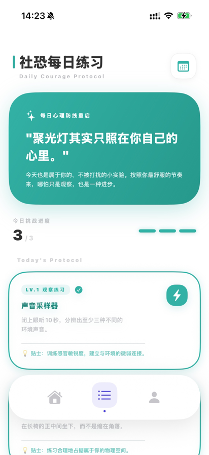 社恐大师,一款克服社恐的app 主要功能: 情景模拟对话:应用内置了丰富的实境对话场景,覆盖职场、校园、聚会、餐饮等多个社交维度。您可以根据自身需要,选择与AI生成的虚拟人物进行多轮对话练习。AI具备优秀的理解能力,能实时生成回应,为您提供一个安全、无压力的环境来锻炼沟通技巧,为真实世界的交流做好准备 心态平静练习:当感到焦虑时,您可以随时进入“静心空间”。该模块提供了专业的呼吸调节引导,帮助您在社交场合前后快速平复紧张情绪,调整心态,以更放松、自信的状态面对他人 每日社恐练习:应用每天会为您精准推送三道贴合实际生活的练习题。这些题目可能涉及如何开启话题、如何得体地拒绝他人、如何表达不同观点等实用社交技巧。通过日积月累的微练习,您能持续夯实社交技能,潜移默化地提升自信。 【自动续订购买VIP】 续订周会员 会员特权:无限次Ai社交演练次数 可随时取消订阅 续订月会员 会员特权:无限次Ai社交演练次数 可随时取消订阅 续订年会员 会员特权:无限次Ai社交演练次数 可随时取消订阅 付款:确认购买,即从苹果iTunes账号扣款; 续费:到期前24小时,苹果自动从iTunes账号中扣费并延长会员周期; 取消续订:如需取消续订,请在当前订阅到期24小时以前,手动在iTunes/Apple ID设置管理中关闭自动续订功能。 隐私政策:https://docs.qingque.cn/d/home/eZQCt9dRATO4d0oguUYllqL3R?identityId=1qgbMXWXxf1 连续包月协议:https://docs.qingque.cn/d/home/eZQCjl0i_pdngRzuPN8i_tzFs?identityId=1qgbMXWXxf1