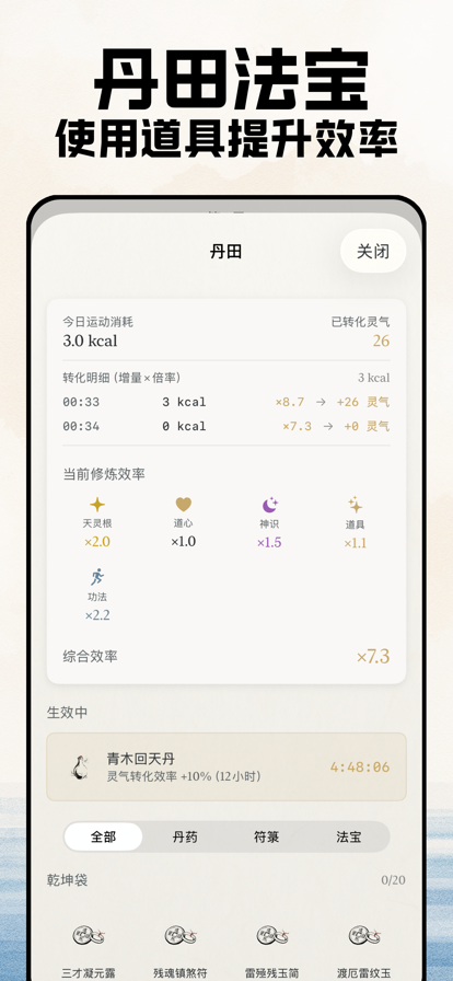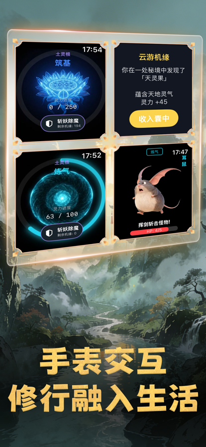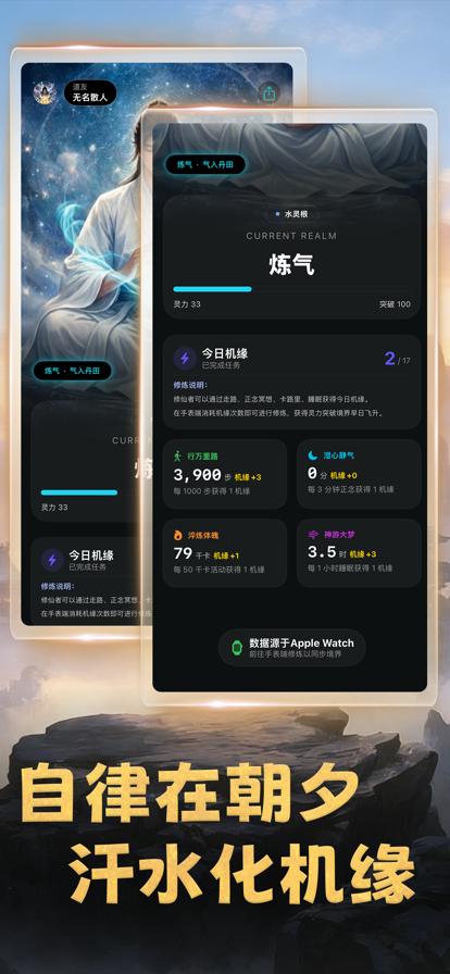 本应用旨在解决传统运动数据枯燥、缺乏长期动力的问题。我们引入了独特的“东方修仙”叙事主题,建立了一套“以肉身积攒机缘,以机缘换取造化”的正向反馈机制。应用将你在现实中的每一次健康行为转化为干涉修仙世界的筹码,激励你养成自律、活跃的现代生活方式。你的身体,就是最强的修炼法宝。 【核心功能与玩法机制】 1. 健康数据转化引擎:积攒修仙【机缘】 应用实时监测你的核心健康数据,并将它们统一转化为——“机缘”。你在现实中越自律,在修仙界获得的机缘就越多。 * 行脚与精元(步数与卡路里): 将现实的行走步数与运动消耗的热量,折算为修行的基础机缘。鼓励多走动、多挥汗。 * 静心与冥想(正念): 通过监测心率变异性引导呼吸与冥想。每一次成功的静心时刻,都将化作感悟天道的机缘。 * 神识温养(睡眠): 充足且规律的睡眠不仅恢复精力,更是获取机缘的重要途径,督促你改善作息,拒绝熬夜。 2. 腕上沉浸历练:消耗机缘,修炼造化 当积攒了足够的“机缘”,你便可在手表端开启修仙历练,获取灵力提升境界修为。 * 降妖除魔(战斗历练): 使用苹果手表体感战斗,挥动手臂即可斩妖除魔,获取大量【灵力】,这是提升你修仙境界的根本。 * 云游探宝(奇遇探索): 消耗机缘进行随机的云游探索,有概率发现上古遗迹或仙人洞府,获取稀有的【宝物】、丹药或功法残卷。 3. 动态境界背景: 从练气期的云雾缭绕,到元婴期的法相天地,境界背景随着你的修为提升而不断进化。 史诗级突破动画: 每次大境界跨越,都将播放一段华丽的突破过场动画记录你修仙路上的里程碑时刻。 【数据隐私说明】 本应用通过 HealthKit / Health Connect 访问用户的健康数据均在设备本地处理,仅用于应用内的计算与展示。 *请勿删除手表端应用,否则会导致修炼数据丢失。 *反复切换手表、手机设备修炼可能会导致同步数据出现误差。
