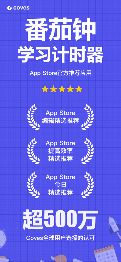 Coves:学习计划 x 专注计时 x 智能复习,一站式学习中心 —— Apple官方精选推荐,备受信赖的高效学习工具 —— 基于四象限、番茄工作法与艾宾浩斯遗忘曲线,构建你的科学学习闭环 1. 产品定位 Coves 是一款智能学习效率工具,专为学生与终身学习者设计。 它以专注计时器为交互核心,深度融合 「四象限任务管理」、「番茄工作法」与「艾宾浩斯遗忘曲线」 三大经典方法论,为你构建从 计划 → 执行 → 复盘 → 优化 的完整学习工作流。 不止是工具,更是你的个人学习效率系统。 2. 解决的核心痛点 • 【任务繁杂,无从下手?】 使用 四象限矩阵 智能区分优先级,结合 时间块规划,清晰安排每日学习计划。 • 【专注力差,易受干扰?】 启动 沉浸式番茄钟,搭配白噪音,有效锁定注意力,进入心流状态。 • 【学完就忘,复习低效?】 开启 智能复习计划,系统基于艾宾浩斯遗忘曲线,自动安排最佳复习节点。 • 【时间黑洞,缺乏反馈?】 查看 数据热力图与详尽分析报告,直观对比“计划 vs 实际”,获得个性化改进建议。 3. 核心功能亮点 学习计划与目标系统 • 四象限任务管理器:直观区分“重要且紧急”任务,告别盲目忙碌。 • 时间块规划:将任务分配到具体时间段,生成可执行的每日计划表。 • 目标设定与追踪:支持设置每日/每周专注时长目标,让努力可视化、可量化。 多维度专注计时器 • 番茄工作法(25+5):经典工作-休息节奏,培养可持续的专注习惯。 • 正计时 / 倒计时模式:自由计时,适配深度阅读、考试模拟、演讲练习等多种场景。 • 全流程数据记录:自动追踪每次专注的时长、中断次数与原因,为深度复盘提供坚实基础。 智能复习与数据分析 • 遗忘曲线复习计划:为任意学习任务开启后,系统自动推算记忆周期并推送复习提醒。 • 学习数据全景看板:提供专注度趋势图、每日/每周时段热力图、项目时间分布等多维度可视化报告。 • AI驱动的效率反馈:基于你的长期行为数据,生成个性化的专注力提升与时间优化建议。 无缝体验与全平台支持 • 跨平台同步:完美兼容 iOS 与 Android 设备,所有数据实时云端同步。 • 桌面小组件与快捷操作:在手机桌面一键启动专注,或快速查看今日进度概览。 4. 用户实证 “考研上岸的核心工具! 四象限让我分清主次,每天感觉多出3小时有效学习时间。自动复习计划让我专业课背了5轮都牢牢记住。” —— 王同学,2025级硕士研究生 “从重度拖延到稳定专注。 以前学1小时就坐不住,现在用Coves的番茄钟和数据复盘,日均专注轻松超过4小时,看着热力图填满特别有成就感。” —— 李同学,临床医学专业 “拯救了我的期末季! 复习科目多到爆炸,用它安排好每天的计划和复习节点,成绩从B冲到了A,终于不用通宵熬夜了。” —— 张同学,大学三年级 5. 立即开始高效学习 • 【完全免费使用】 基础功能零收费!学习计划、番茄钟、基础数据统计均可免费使用。(可试用高级版数据功能) • 【高级版解锁完整能力】 升级可体验完整的 智能复习计划、专业版数据分析报告、无限项目 等高级功能,获得全面进阶体验。 了解更多与获取支持 • 官方网站:https://softwindlab.com • 联系邮箱:softwindlab@gmail.com • 小红书:https://www.xiaohongshu.com/user/profile/66275f250000000003026bd5 • Bilibili:https://space.bilibili.com/1622491561 由 SoftwindLab 匠心呈现,用科技赋能每一份专注。