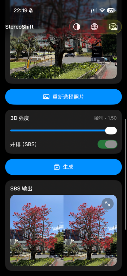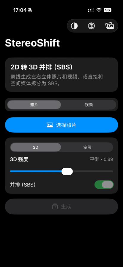 StereoShift 是一款专注于 3D 左右格式(Side-by-Side,简称 SBS)的照片/视频转换工具。 你可以把普通 2D 照片/视频生成更具立体感的 SBS 3D 内容,也可以把空间照片/空间视频快速转换成更通用的 SBS 格式,方便在支持 SBS 的播放器、显示器、头显或工作流中观看与分享。 本地网络网页共享 (VR 3D 观看) 在应用内图库中启动网页共享,即可在您的 Wi‑Fi 网络上发布一个私密的、受 PIN 码保护的图库。在同一网络上的任何浏览器中打开该地址,包括 VR/AR 头戴设备,浏览缩略图列表,然后点击观看。对于 SBS 媒体,按下“进入 VR”即可观看沉浸式立体 3D 照片和视频。所有内容都保留在您的本地网络上 (无上传)。在共享时保持 StereoShift 在前台,并随时停止网页共享。 ==================== 【为什么选择 StereoShift】 ==================== - 只处理你选中的媒体:不需要授权访问整个照片库。 - 全程离线本地处理:无需网络也能使用,不上传你的照片/视频。 - 硬件加速:优先使用神经引擎与 GPU,让转换更快、更顺畅。 - 结果好管理:支持保存到系统照片,也支持保存到应用内画廊集中管理。 - 观看更舒服:输入/输出都支持全屏预览,视频全屏自动播放并循环。 - 空间媒体支持:空间照片/空间视频可直接分离左右视图输出 SBS。 ==================== 【功能亮点】 ==================== 1) 2D 照片 → 3D SBS - 一键生成:选择照片即可生成左右并排的 3D 图像。 - 强度可调:提供 3D Strength 调节(细腻/均衡/强烈),适配人像、风景、室内、微距等不同题材。 - 结果直观:生成后可立即全屏预览,检查景深层次与边缘细节。 2) 2D 视频 → 3D SBS - 逐帧渲染:将 2D 视频渲染为左右并排的 3D 视频。 - 保留原音频:不会移除或静音视频音轨,观看更沉浸。 - 进度可见:显示百分比与已处理时长,长视频也能安心等待。 - 随时停止:转换中可点击停止并二次确认,避免误触。 - 稳定优先:在加速路径出现异常时会自动回退到可靠实现,尽量避免输出全黑或损坏文件。 3) 空间照片/空间视频 → SBS - 直接分离左右视图:不需要深度模型,转换更快、更稳定。 - 模式更清晰:空间模式下只展示空间媒体;2D 模式下会过滤空间媒体,减少选错。 ==================== 【工作原理(简单说)】 ==================== - 2D → 3D:先在本地进行深度估计生成深度图,再根据深度对画面进行左右视图变形,最终合成为 SBS。3D Strength 会影响左右视图的位移幅度,从而改变立体感强弱。 - 空间 → SBS:直接提取/分离原始的左右视图并拼接为 SBS,因此不需要深度模型。 ==================== 【预览、分享与保存】 ==================== - 输入也能全屏预览:选择素材后可点击卡片进入全屏,先确认画面与构图。 - 输出全屏检查细节:生成后可全屏查看图片/视频,检查边缘、景深与立体强度。 - 视频只在全屏播放:避免页面里误播放占用资源;进入全屏自动播放,退出自动停止,并支持循环播放。 - 静音模式也能播放声音:在 iPhone 静音开关开启时,预览视频仍可正常播放音频(系统音量为准)。 - 一键分享:可直接分享生成的图片或视频到社交平台、聊天工具、剪辑软件等。 - 双重保存方案: - 保存到系统照片:方便统一管理与备份。 - 保存到应用内画廊:更适合把作品留在 App 内,避免相册被大量中间结果刷屏。 ==================== 【应用内画廊:本地管理更省心】 ==================== - 列表预览:快速浏览所有已保存的图片与视频。 - 单项预览:点开即可全屏查看,视频支持全屏播放与循环。 - 删除更方便:预览单个项目时可直接删除,节省整理时间。 - 需要时再导出:可从画廊一键分享,或保存回系统照片。 ==================== 【导入方式:从照片或文件都可以】 ==================== - 使用系统照片选择器:只选择你要转换的照片/视频即可。 - 在 Mac 上:除了从照片选择外,还支持从文件夹导入(例如下载、文档、桌面等),更适合管理本地素材。 - 自动匹配媒体类型:照片/视频模式清晰分离,减少误操作。 ==================== 【转换流程与防误触】 ==================== - 转换开始后会显示遮罩与进度弹窗,避免误触其它按钮导致中断。 - 停止转换需要二次确认;取消后可继续转换。 - 转换完成后可直接查看结果并进行分享/保存操作。 ==================== 【隐私优先:只访问你选择的内容】 ==================== StereoShift 的设计目标之一就是:不需要整库权限,也能完成转换。 - 只访问你选中的照片/视频:你选择哪一个文件,App 才会读取那一个进行处理。 - 不要求“访问整个照片库”:不会请求浏览你所有相册与全部媒体。 - 仅在你点击保存到系统照片时,才需要用于写入的权限(添加到照片库)。 - 不创建账号、不要求登录。 ==================== 【离线本地处理:没网也能用】 ==================== - 全流程在设备本地完成:不上传、不云端处理。 - 你可以在没有网络的环境下使用 StereoShift:出差、旅行、飞机上都能转换与预览。 - 由于不上传媒体,我们无法访问你的照片或视频内容。 ==================== 【硬件加速:更快、更顺畅】 ==================== - 2D → 3D 需要深度估计:StereoShift 使用 Core ML,在支持的 Apple 设备上会优先使用内置神经引擎(Neural Engine)进行推理加速;如不可用则使用 GPU,再回退到 CPU。 - 画面变形与合成也尽量使用 GPU 加速,并在必要时自动回退,兼顾速度与可靠性。 - 转换期间保持屏幕常亮,降低系统因息屏而中断任务的概率(尤其是长
