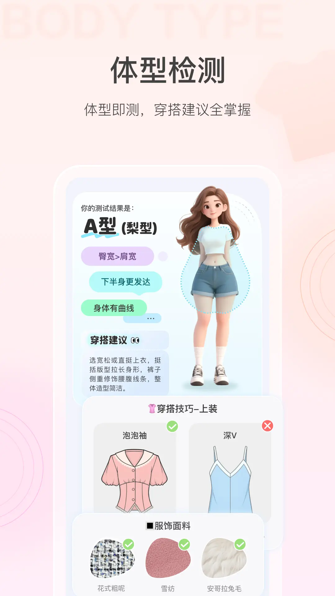 -全新首页 & 个人中心<br>界面更清爽,操作更流畅,体验全面升级。<br><br>-AI体型测试(新增)<br>输入肩腰臀等数据,智能判定体型,提供个性化穿搭建议,扬长避短,穿出更佳比例。<br><br>-AI肤质测试(新增)<br>基于人脸识别与皮肤分析,快速检测肤质类型,推荐合适的护肤方案,让美丽更科学。<br><br>-AI智能测脸型<br>精准识别脸型,推荐专属发型与妆容,颜值一秒提升。<br><br>-个人专属色彩测试<br>找到最适合你的色彩搭配,让穿搭和妆容更显气质。<br><br>-AR智能试妆<br>百变妆容 & 发型一键预览,真实还原效果,轻松避坑。<br><br>-证件照轻颜打造<br>一键生成自然又专业的证件照。<br><br>-美妆社区互动<br>发现达人分享,发布内容赢取新品试用权,边玩边变美。<br><br>- 联系我们<br><br>1.美的你APP:我的页面-右上角-用户反馈<br><br>2.官方微信公众号:美的你(MACCO01)<br><br>3.官方微博:@美的你APP<br><br>解锁高级试妆、无限体型 & 肤质分析、专属色彩方案等特权功能。