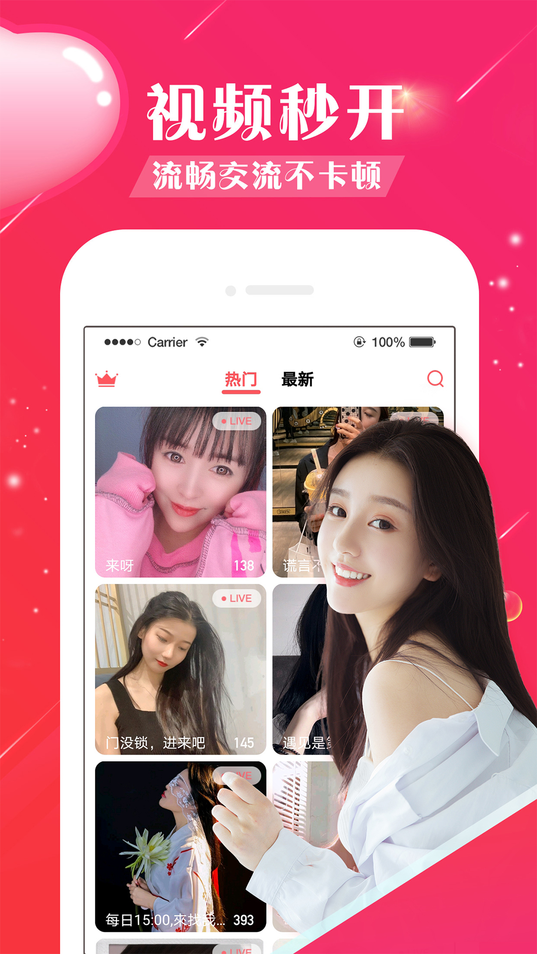 【直播交友】表爱慕,送礼物,做管理,做粉丝,实时互动,让单身狗不孤单,让心仪的“ta”不再遥不可及。<br><br>【动态社区】捕捉直播精彩,记录生活美好,分享当日心情,共享快乐源泉,让别人的心,因你而跳动。<br><br>【俊男靓女】清纯校园风,幽默达人秀,火热小辣妹,高冷御姐范,萌宠小萝莉……汇集全国各地风格迥异的才男才女。众星云集,总有一个适合你。<br><br>【动态短视频】五花八门的好看热门短视频风格,高冷、美艳、俏皮、搞怪,不一样的新颖小视频体验。<br><br>【互娱直播】帅哥美女主播在线开聊,甜蜜情话、搞笑段子、天籁唱将、热辣舞蹈,你想看的,这里都有。<br><br>人世间纵有风情万种,我却情有独钟。只要我的心还在跳,它便是因你而跳。拥有你,是我生命的精彩,我的信心来自你的魅力。 <br><br>特色功能:<br><br>【超强体验】看直播像刷短视频一样便捷,唰唰唰!你喜欢的主播就来了<br>【签到奖励】签到就能领礼物,让你在平台不花钱也能玩嗨<br>【动态圈】晒出你的生活百态