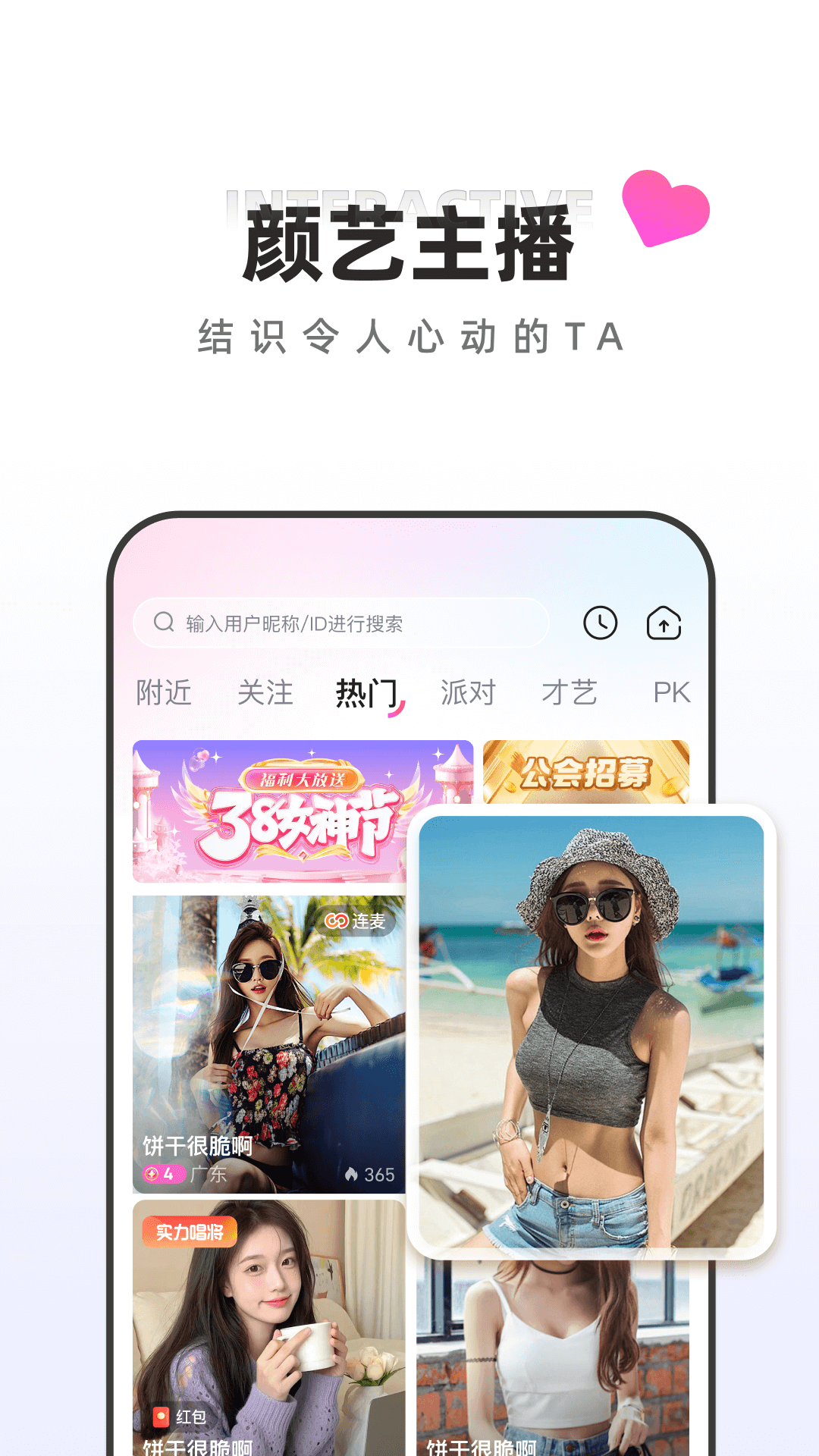 一个充满活力和创意的平台,让你轻松展现自我,与世界分享你的精彩。 高颜值在线秀场直播平台,这里有热门视频直播、真人才艺秀场、惊艳热舞、搞笑趣动短视频。 众多好看好玩的直播内容,精彩不停。更有数万名主播同时在线,与你即时互动,狂嗨不停!<br> [功能亮点] <br><br>[海量主播]校花校草、草根型男、人气歌姬、国 风少女,百变魅力主播可盐可甜任你聊;<br><br>[精彩直播]音乐蹈、K歌好声音、搞笑才艺、脱口秀。7*24小时火爆直播精彩不停; <br><br>[动态社区]精选短视频/图文动态集结地,精彩好看吸睛不腻; <br><br>[炫酷特效]全屏礼物特效,尊贵出场特效,让你享受帝王般尊贵体验!