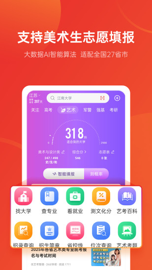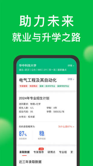 高考志愿填报领导品牌,基于”人工智能+大数据分析”,为高考生提供精准的志愿填报指导和科学的复习备考服务。 -智能填报: 基于高考升的海量院校、专业/专业组历年录取大数据,结合考生高考成绩、志愿偏好,帮助千万考生完成高考志愿模拟推荐,辅助甄选理想大学;且高考升招录数据会依据官方公布数据实时更新; --信息查询 查询国内高校、专业、职业的详细信息,帮助考生提前了解意向院校、专业概况、未来职业前景与技能要求; --志愿讲堂 邀请顶级高校学霸和志愿填报专家,帮助学生启蒙大学知识、掌握志愿填报技巧与策略;讲解主题丰富多样,后续将会持续更新; --高三冲刺课 把握高考趋势,明确复习重点。考点爆破,真题解析,手把手带领学弟学妹冲刺提分; --测评系统 通过权威测评,帮助考生全面了解自身优劣,通过科学的方法选择专业、准确定位职业发展方向,让性格和特长完美结合; --高考百科 高考知识的百科全书,平台志愿填报专家精心整理的涵盖 大学、专业、新高考、招生录取、志愿填报、考试政策等相关高频、易混词汇,帮助考生家长了解报考知识、冲刺理想大学 ... 高考志愿填报利器,更多功能等你探索!