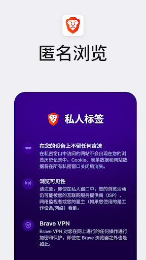 Brave网络浏览器是私密、安全的网络浏览器,可以免费阻止第三方广告。Brave 的浏览器和搜索引擎深受 9700 多万用户喜爱。 Brave 拥有 AI 助手 Brave Leo、防火墙 + VPN 以及广告拦截等功能。 <br><br>Brave网络浏览器是一款快速、安全的安卓网络浏览器应用程序,内置第三方广告的广告拦截器。Brave浏览器快速、安全而私密,可以防止你被广告跟踪或被恶意软件和弹出窗口感染。立即下载最好的网络浏览器。<br><br><b>🔒快速安全的网络浏览器</b><br>无需外部插件或设置!Brave网络浏览器为安卓提供最安全、最快速的网络浏览器。享受无弹出窗口(弹窗拦截器)、恶意软件和其他烦恼的浏览。<br><br><b>🚫广告拦截网络浏览器</b><br>Brave网络浏览器应用程序设计有内置的广告拦截器(弹出窗口阻止程序)。Brave的免费广告拦截器可以在你浏览网页时保护你免受跟踪广告的侵害,保护你的隐私。<br><br><b>🙈自动隐私 - 广告拦截浏览器保护</b><br>Brave网络浏览器应用程序还可以提供领先的隐私和安全功能,例如HTTPS Everywhere(加密数据流量)、脚本阻止、第三方cookie阻止和私人选项卡。<br><br><b>应用功能</b><br>• 内置广告拦截浏览器<br>• 弹出窗口阻止程序<br>• 节省数据和电池<br>• 阻止侵犯隐私的广告<br>• 安全地同步书签<br>• 跟踪保护浏览器<br>• HTTPS Everywhere(为了安全)<br>• 脚本拦截器<br>• 第三方cookie阻止程序<br>• 历史<br>• 私人标签<br>• 最近标签<br>• 快速搜索引擎<br><br><b>关于Brave</b><br>我们的使命是,通过创建安全、快速和私密的浏览器来拯救网络,同时增加内容创作者的广告收入。安全快速的浏览是通向开放网络更光明未来的途径,Brave旨在通过微支付和新的收益分享解决方案改变在线广告生态系统,为用户和发布商提供更好的交易。<br><br>要了解有关Brave网络浏览器应用程序的更多信息(该应用程序具有内置广告阻止、跟踪和安全保护),请访问https://www.brave.com<br><br><b>问题/支持?</b><br>请通过https://brave.com/msupport与我们联系。我们很高兴收到你的消息。<br><br>喜欢这款应用程序?请给我们留下五星评价!<br><br>立即下载最好的浏览器。