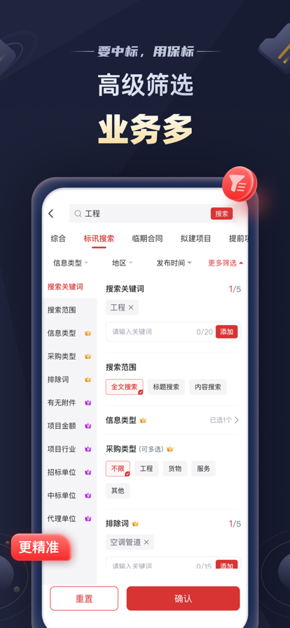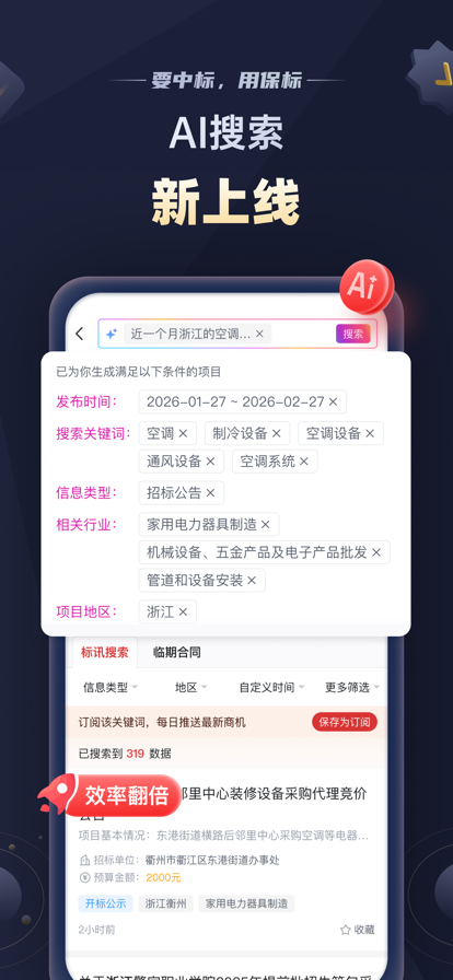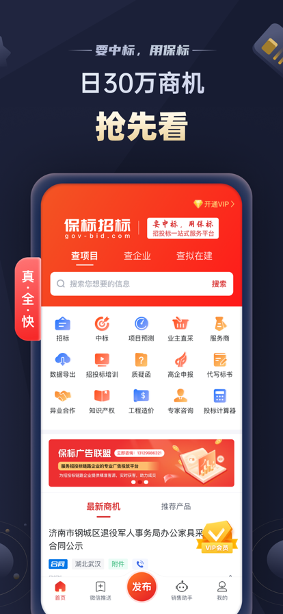 保标招标,要中标,用保标。 招投标全流程服务平台。 【应用介绍】 保标招标是一款领先的招投标大数据服务平台,涵盖2000+行业,覆盖全国各省市县,全面满足个性需求,掌握更多商机。 招标信息查询,中标结果推送,拟建项目跟踪,企业资质查询,招标订阅推送,行业招标公告,数据导出功能,AI招标预测,跨地区项目搜索,跨地区投标资源。 保标AI搜索上线,一句话搜全网标讯。自动拆解关键词、匹配历史项目、推送精准商机--效率翻倍,商机翻倍。 找项目找业务就是这么简单,日均标讯更新30万+,商机获取能力提升300倍,98%的同行都在用保标寻找销售机会。 【应用特点】 标讯信息全网覆盖,实时更新,找项目找商机,找业务找渠道。 精准匹配你需要的商机,实时推送,获取项目更精准。 信息来源真实、权威、及时,快速提高您把握项目的能力。 今天发布的招标公告,公司季度招标计划,如何参与地区招标。 招标费用智能计算,废标风险智能预警,行业招标趋势分析。 低价高价招标信息平台,如何提高中标率,竞争对手历史中标数据。 【覆盖行业】 工程建设:建筑工程、水利工程、电力工程、交通运输、市政基建、建筑材料、装修工程、消防工程、矿山工程 医疗卫生:医疗设施、医疗器械、医疗耗材、康复器材、药品采购 环保绿化:环境工程、环卫工具 信息建设:系统集成、计算机硬件、计算机软件、通信工程 办公文教:教学设备、办公用品、办公家具、体育器材、办公耗材 服装家电:服装服饰、家电业 商业服务:外包服务、运输服务、劳务服务、科技服务、运维服务、会务培训服务、法律服务、社会服务、汽修服务 机械设备:机电设备、车辆及特种设备、电气设备、仪器仪表、安防设备、警用设备、消防设备、电力设备、勘察设备、演出设备、殡葬设备、工业设备、农业设备、工程设备 农林牧渔:农业、林业、牧业、渔业 能源化工:化工原料、化学 智能制造:智能控制 资源交易:土地矿权、产权股权 物资类:副食品、日用品、工业用品、果蔬生鲜、粮油 【涵盖省份】 北京市、天津市、上海市、重庆市、河北省、山西省、辽宁省、吉林省、黑龙江省、江苏省、浙江省、安徽省、福建省、江西省、山东省、河南省、湖北省、湖南省、广东省、海南省、四川省、贵州省、云南省、陕西省、甘肃省、青海省、台湾省、内蒙古自治区、广西壮族自治区、西藏自治区、宁夏回族自治区、新疆维吾尔自治区 【联系我们】 保标招标平台(客服经理:18995537603) 数据服务与定制(数据定制:18986107388) 投标全流程服务(标书服务:13072786231) 招标邮箱:379658874@qq.com 官方网站:www.gov-bid.com 保标招标团队感谢您的使用!