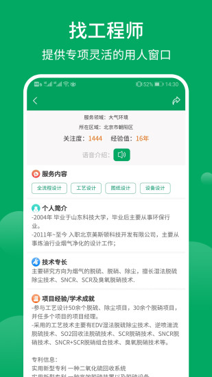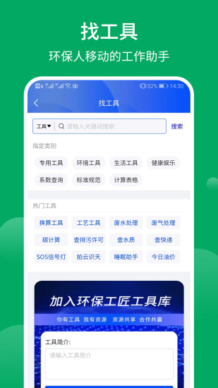 环保工匠”APP提供了专用工具、环境工具、生活工具、健康娱乐等百余种工具;开发了找工具、找工程师、找技术、找产品等资源栏目,整理收集了众多的技术规格参数及标准规范,融入问吧互动栏目,方便学习和分享,是一款创新研发的环保工具产品。 [找工具] 包含专用工具、环境工具、生活工具、健康娱乐等百余种工具,满足了环保人士的各种需求。 [找技术] 包含废气治理、废水处理、固废危废、环境修复、资源化、噪声污染、智慧物联、民用环保等八大环保领域的环保技术。 [找产品] 汇集废气、废水、固废、药剂、仪表五大领域的环保产品。 [找工程师] 集成水环境、大气环境、环境修复、环境监测、低碳节能、固废资源化、噪声治理等领域的专业工程师人才,提供顾问咨询、项目设计、安装调试三大服务。 [问吧] 提出自己的问题,与同频的人互动交流。