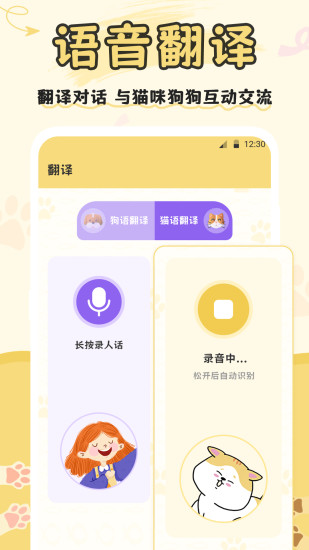 你是不是也想知道家里的猫咪和狗狗到底在想什么?它们是不是饿了渴了?是不是想出去玩了? 该功能主要供您和宠物娱乐使用哦!希望给您带来更多快乐! 本应用是集猫语翻译和狗语翻译为一体的宠物翻译器,当然也是可以用来逗趣小野猫小野狗的动物翻译交流神器。 【人猫人狗互译】将我们人说的话转换为猫咪或狗狗可以听懂的语言,也可以将猫咪和狗狗的叫声翻译成我们可以听懂的话。 【逗宠语音】我们收集了海量不同猫猫狗狗在不同心情,不同场景时的叫声,方便主人与自己的爱宠玩耍,拉近与爱宠之间的距离。 【趣玩】支持为宠物建立档案,方便主人记录自己宠物的体重和生日等信息;也可以设置提醒事项,再也不会忘记带它打针洗澡;还可以将宠物的年龄换算为人类的年龄,看看你家宝贝今年多大啦!
