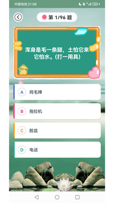 趣味答题猜谜是一款包含了各种百科知识的答题和猜谜语软件,让您在在答题的过程中体验学习知识的乐趣,在娱乐中促进知识的增长。软件包含了多款模块: (1)选择题、判断对错:生活中的各种百科知识,哪个是你不知道的呢,快来挑战一下就知道了。 (2)谜语浏览、猜谜语:包含了数千个谜语,让您逐个破解。 (3)记忆答题、猜植物、前奏猜歌等:各种五花八门有趣的答题,让您开心闯关。