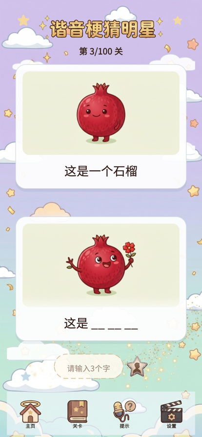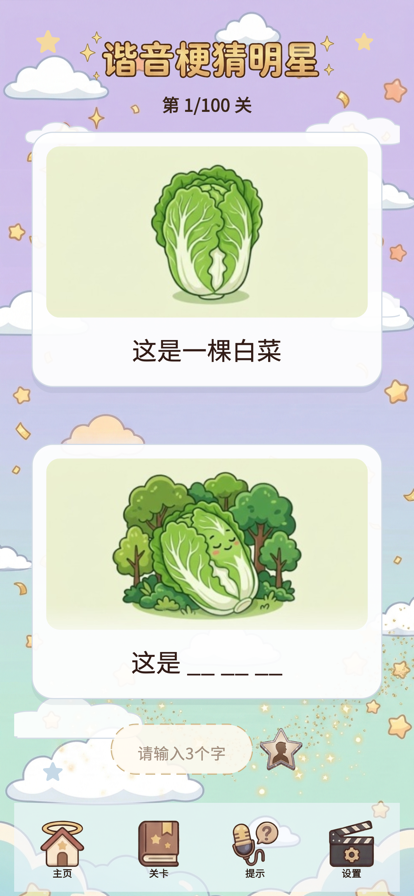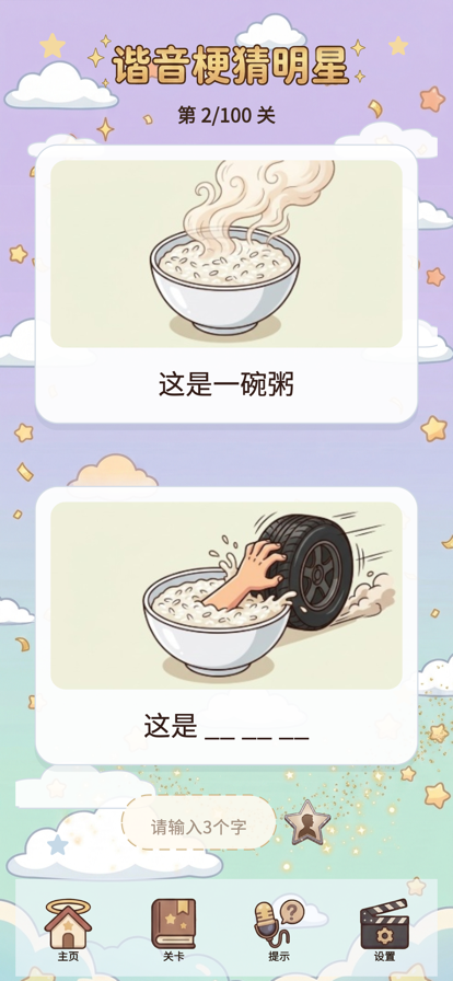 《谐音梗猜明星》是一款轻松上头的看图猜谜游戏。每一关都会给出两张脑洞图片和字数提示,你需要根据画面里的谐音联想,猜出对应的明星名字。规则简单,但越玩越容易停不下来;有些题一眼秒懂,有些题则会让你忍不住笑着拍腿。 游戏特色: - 100 道明星谐音关卡,内容丰富,越猜越上头 - 两张图 + 字数提示,玩法直观,上手零门槛 - 答对即可解锁下一关,进度自动保存 - 关卡附带解析,答对后还能回味谐音脑洞 - 卡关时可获取提示,兼顾挑战感和轻松体验 - 清爽界面搭配音效反馈,适合碎片时间随时来一局 如果你喜欢看图猜词、谐音梗、明星话题,或者想找一款能放松又能动脑的小品类益智游戏,《谐音梗猜明星》会很适合你。 来试试你的观察力、联想力和“梗感”到底有多强,看看你能一路猜到第几关。