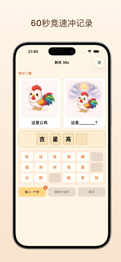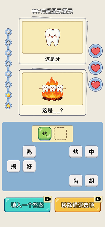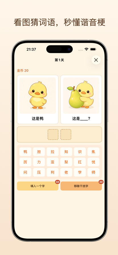 一款轻松上头的谐音梗猜词游戏! 看两张图,猜一个词,越玩越上头。 【两种玩法,随时开玩】 - 单人闯关:从简单到离谱,越玩越停不下来 - 60秒竞速:手速脑速一起拉满,冲击最高记录 【关键时刻,道具救场】 - 填入一个字:卡关时一招破局 - 移除干扰字:快速排除错误答案 题目有趣、节奏轻快、随时来一局。 快来试试你是不是天生梗王!