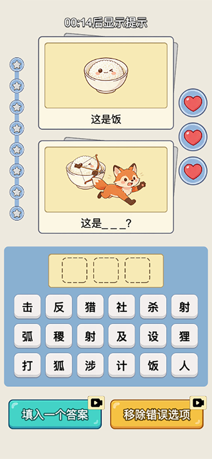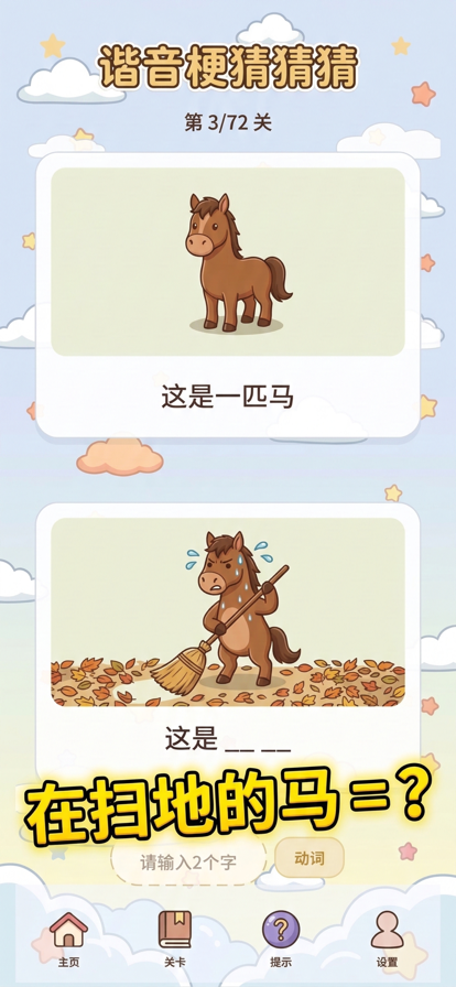 这是一款把“游戏”与“谐音梗”巧妙融合的创意作品:你将在轻松有趣的关卡中,解锁层出不穷的机智双关、爆笑冷梗和意想不到的语言反转。每一次选择,都是对想象力与语感的挑战;每一次通关,都是“我居然猜到了!”的成就时刻。 无论你是梗王、文字控,还是想在碎片时间里收获快乐,这款游戏都能让你笑着动脑、玩到上头。准备好了吗?让我们一起在字里行间,开启这场妙趣横生的谐音闯关之旅!