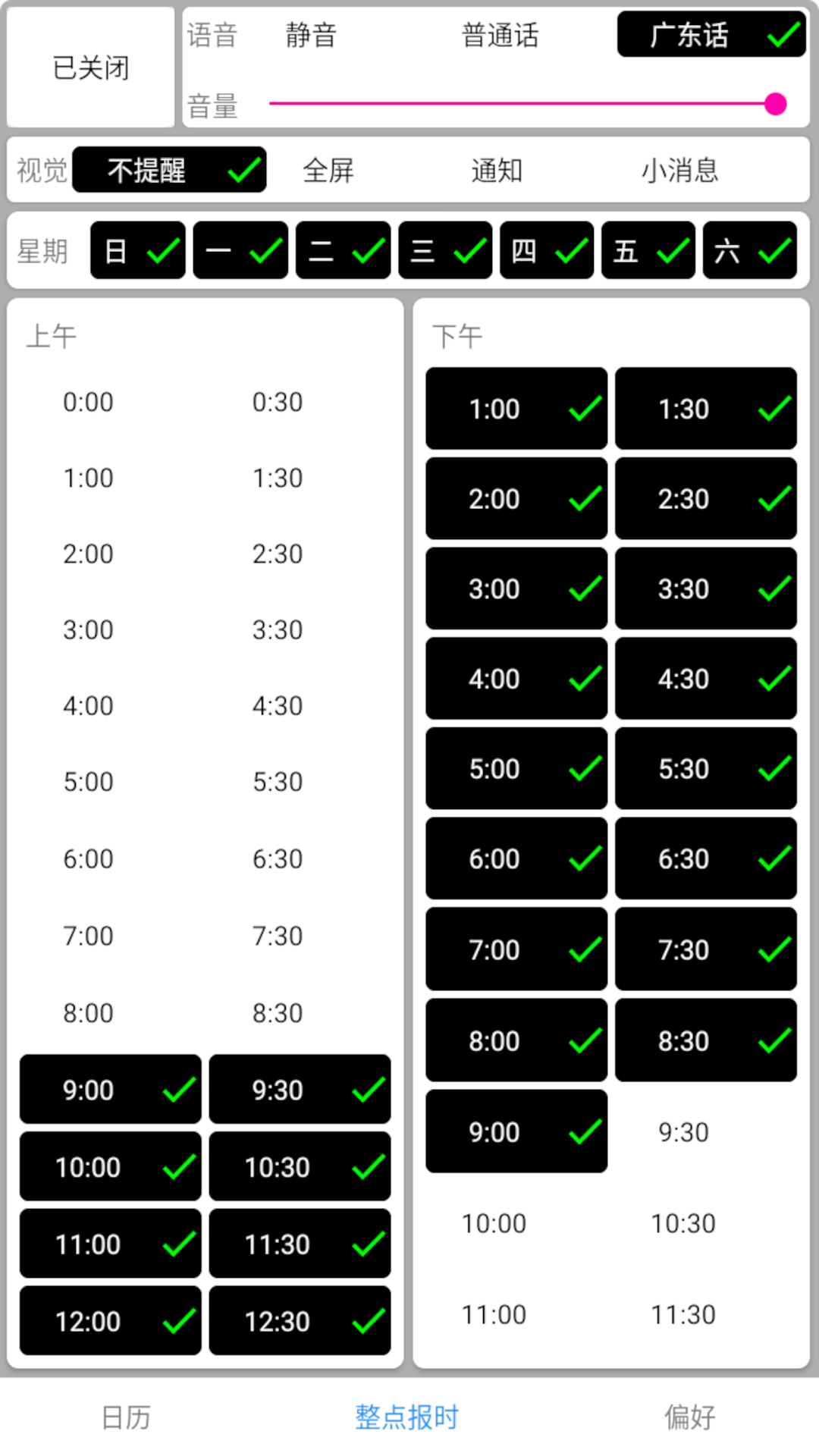 正点报时是一款简单易用的报时软件。 正点报时实现整点半点报时功能,提醒方式包括视觉及语音。 视觉提醒可选全屏提醒,占据全屏且需要用户点击确认后消失,适合比较重要的时间提醒;可选通知提醒,提醒信息将会出现在状态栏,并在一定时间后自动消失;可选消息提醒,提醒信息会出现在下方,只会显示几秒时间。 语音提醒提供普通话和粤语。 正点报时也集成日历表,显示农历及节气。