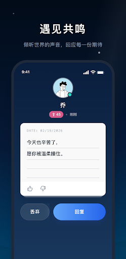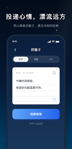 耳语漂流瓶是一款主打情感共鸣与深度陪伴的治愈系社交应用。在这里,你可以卸下生活中的压力与防备,将那些不便发朋友圈的小情绪装进瓶子,投向广阔的海洋。我们致力于建立一个真诚、温暖的社区,帮你在茫茫人海中,寻找那个能产生同频共振的灵魂。<br><br>核心特色:<br><br>【漂流传情】<br>将想念、愿望或生活点滴封装进漂流瓶。在这个节奏飞快的时代,重拾文字的力量,体验投掷与开启之间的那份惊喜与期待。<br><br>【深度共鸣】<br>不仅仅是文字的交流,更是灵魂的碰撞。通过兴趣标签与情感匹配,让你在最需要的时候,总能找到一个温暖的声音在侧。<br><br>【治愈树洞】<br>每个人都有一个不为人知的角落。这里是你私密的精神避风港,记录那些关于成长、爱情与梦想的碎碎念。<br><br>【真诚交友】<br>基于共同的价值观与兴趣,连接志同道合的知己。在这里,每一段交流都始于倾听,成于理解。<br><br>在海浪声中,遇见那个懂你的人。现在就开启你的海洋治愈之旅,小声倾诉,温柔相伴。