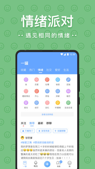 获得小米应用商店金米奖 在没有人认识我的地方, 你才能真正认识我。 做这个从社交恐惧中萌生出来的社交APP,是因为许多人和我一样。 和我一样孤独。 和我一样情绪化。 和我一样是个小透明。 和我一样逃避社交压力。 和我一样,许多话不愿意告诉认识的人,却又在心里憋得难受。 无处诉说,又不愿藏匿的心事,也想被温柔地对待。那就把情绪装进罐头里吧。 在一罐里,你可以用“真身”发布罐头,在个人主页描绘自己的画像,相似画像的人会擦出火花。 你也可以用“分身”的临时身份发布罐头,没有人知道你是谁,也没有人可以追踪你。 真身,意味着认真交友的真诚;分身,意味着绝对隐私的倾诉。 此刻的心事,被装进罐头里,掷入情绪之海,与相同情绪的人共鸣。 陌生人温暖的相遇。