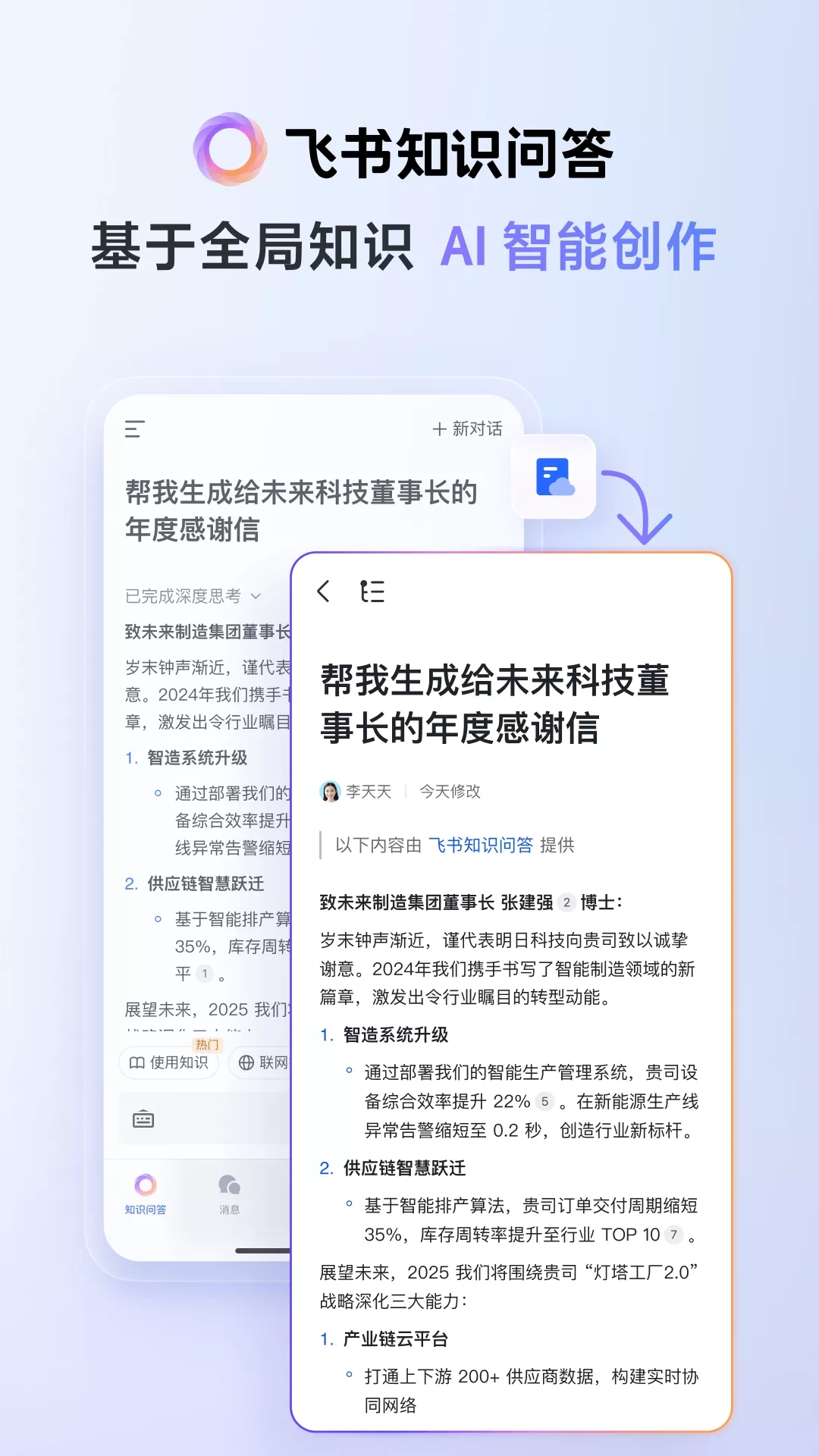 一站式无缝办公协作,团队上下对齐目标,全面激活组织和个人。飞书,定义先进团队的工作方式。 #定义下一代工作方式# - 高效开会用“飞阅会”:会前高效预约会议时间、会中默读共享文档并实时评论协同、会后音视频内容智能转写为笔记。 - 全员协作用飞书文档:飞书文档让创作不设限,散落各处的知识通过知识库沉淀,全局搜索将需要的知识带到你面前。 - 人才管理用飞书People:飞书OKR、飞书人事、飞书绩效、飞书招聘全面助力人才建设。 - 项目管理用飞书项目:飞书项目专为百人以上产研团队打造,沉淀项目标准流程。 - 企业财法用飞书合同和飞书报销:飞书合同让企业合同实现全生命周期管理,飞书报销提供员工报销全流程智能解决方案。 #一站式无缝协作体验# - 飞书“无缝打通”即时沟通、视频会议、日历、云文档、OKR 等强大功能与开放应用,彻底告别零散的多套系统和割裂的协作体验! - 云文档:多人实时协同编辑,一切元素都可插入。 - 视频会议:支持 1000 方稳定接入,便捷共享屏幕和文档,自动生成会议纪要。 - 即时沟通:一站式聚合消息,分类处理会话。 - 日历:便捷订阅同事日历,根据忙闲状态一键预约日程。 - 开放平台:集成各种类型的第三方应用,并提供丰富的 API 接口。 【联系我们】 邮箱:contact@feishu.cn 如有问题或建议,欢迎通过邮件与我们联系。 先进团队 先用飞书