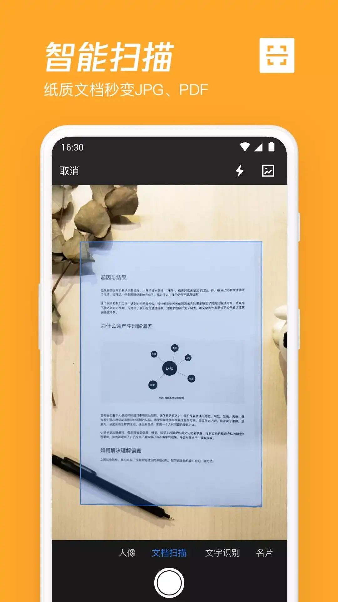 手机描仪,文档管理工具。拍照清晰可切边裁剪图像,裁剪你需要的文件内容,生成PDF。邮件发送、连接打印机、传真、微信共享电脑脑功能齐全、云存储,多设备多途径数据区!实用型的办公无纸化节能工具! 全球几千万用户使用,2011年服务至今 扫描王图像处理技术功能让你的文件清更清晰,陈旧文件也一样可以增强 代替扫描仪,随时随地分享,让你的办公效率显著提高 功能亮点 1:手机上的扫描仪 手机拍照文档,自动切边去除杂乱背景,生成JPGG图片或PDF。 2:图片OCR,可以识别文字 OCR文字识别,拍纸质文件,可以识别图片的文字内容,搜索更简单 3:云存储,让你更安全的管理文件,查阅更方便 手机、平板、电脑,多设备随时,随地查阅文档。 标签归类,手写批注,文档加密,方便有序,高效安全。 4:无线打印,微信,QQ,邮件多功能分享 支持无线打印,可以微信,QQ,邮件多功能分享,还有拼图功用 扫描王的无纸化理念,是为了配合你们的需果,更适合哪些人群 1:商务人士:出差不用携带文件,更可以扫描合同、文件,可以通过微信,邮件等即时通讯工具、共享,随时随地工作 2:学生,教师,教授,音乐,作家,设计师等:随手扫描笔记、课堂讲仪,乐谱,作家手稿、PPT 3:手绘:没有扫描仪,也能把手绘画稿美美地秀给小伙伴们了~ ----使用建议---- 为确保你能获得清晰的扫描图,请在拍照时: * 光线充足,尽量避免抖动 * 尽量使图片占满拍摄屏幕
