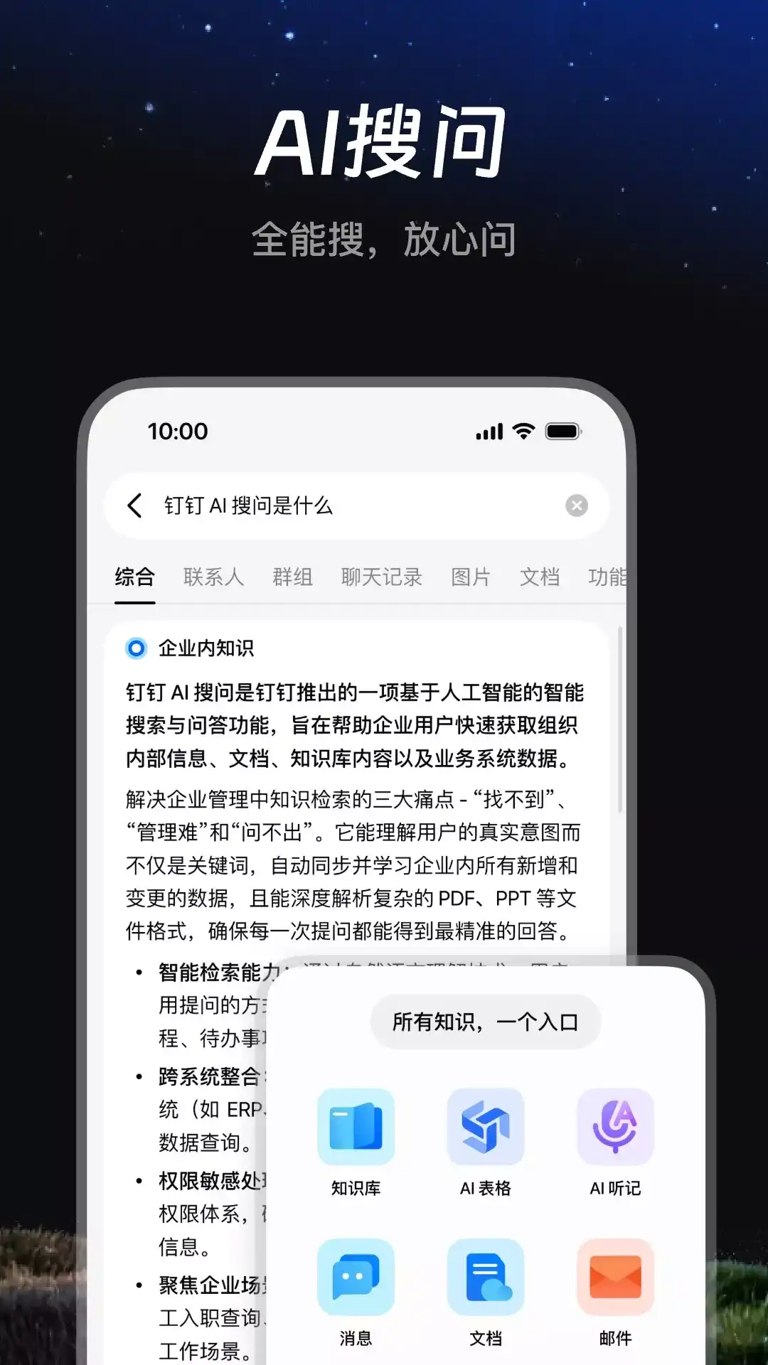 钉钉,AI时代的工作方式。10年来坚持以AI驱动协作,以智能连接价值,服务超千万家企业与组织,让每个企业更快、更强、更具创造力。如今,80%的中国500强企业共同选择钉钉,包括人民日报、中国联通、中国广电、一汽集团、宁德时代、赛力斯汽车、新浪微博、虎扑、中国铁建、太平洋保险、申通快递、长龙航空、柳钢集团、蒙牛、安踏、立白、百丽国际、宇树科技等,覆盖各行各业的标杆客户。 你可以这样打开钉钉: 1、Al钉钉,简洁、高效、以人为本 【智能办公就用 Al钉钉】 操作高效,视觉美观:效率岛,智能判断当前最重要的信息,一键触达 AI办公小助理(DingTalk A1):自动生成总结纪要、行动待办、分析报告,还能同步AI表格 【协同创作就用 文档AI】 智联协作:支持在文档中插入表格、脑图、群聊、日程、视频、任务流等丰富元素,让团队无缝协作 Al创作:创意构思、方案策划、信息整理,Al帮你唤醒灵感一刻;丰富内容、改写语气、润色文案,创作本就如此轻松 【高效开会就用 会议AI】 声纹自动识别:自动匹配多人会议中的发言人字幕 AI时代的记录方式:闪记升级为“AI听记”,30+行业场景模板助你高效开会 2、智能、开放、高效的的协作体验 【文档AI】:一切信息皆可联通,多人编辑实时协同,让团队经验有效沉淀 【会议AI】:Al实时字幕智能转写,可共享屏幕和文档,通过表情、气氛、状态对他人观点表态,远程开会也和面对面一样 【项目AI】:丰富项目模板开箱即用,深度打通文档、群聊、OA审批、Agoal等,实时跟进项目进展 【日历AI】:通过自然语言输入轻松创建日程,智能推荐会议时间及场地,团队调度轻松安排 【全球化能力】:全界面翻译和系统应用支持超 20种语言,国际化会议自动推荐全员适配时段,企业出海无阻碍 3、企业级组织数字化和业务数字化平台 【AI表格】:让每个人成为AI应用“创造者”,无需开发,像做表格一样,丰富的500强企业同款模板,轻松搭建业务系统 【AI搜问】:企业+全网信息一搜即得,答案、方案、计划一步到位 【钉钉管理套件】:提供人事管理、财务管理、差旅管理、客户管理、合同管理、招聘管理等一站式管理数字化方案,助力企业经营升级 【钉钉LTC解决方案】:为企业提供目标制定拆解、销售跟进、项目交付、持续服务的端到端一站式平台
