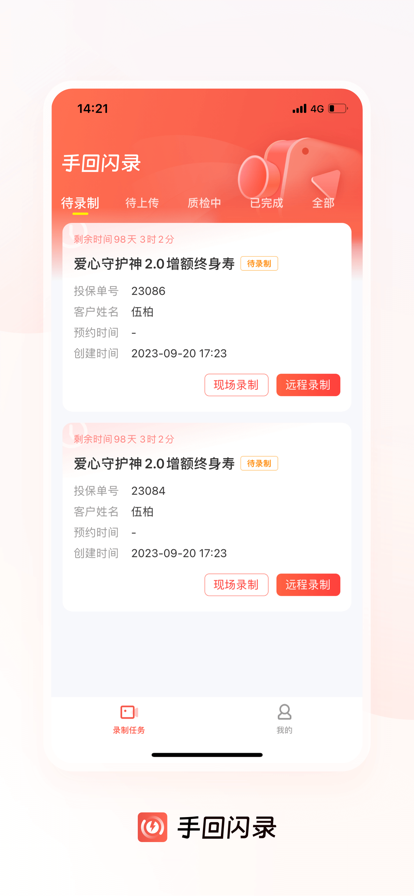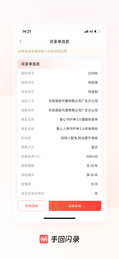 手回闪录是一款面向保险行业所有代理人提供的智能保险双录工具。 1. 智能化、标准化录制流程 2. 全程自动语音播报、语音识别,快速高效 3. AI预质检,不通过可当场补录,录制更高效