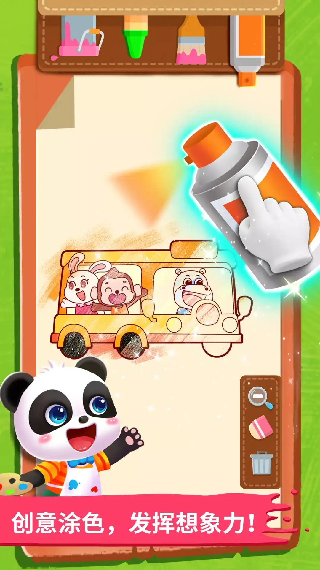 爱画画的宝宝们,【宝宝小画板】来啦!在这里,宝宝可以随心涂鸦、创意填色,激活宝宝的创作天赋,艺术之路从此开始! · 随心涂鸦,激发宝宝创作欲 丰富的画笔工具:铅笔、蜡笔、毛笔、刷子……宝宝喜欢用哪种工具画画?快来选选!还可以交替使用多种画笔,绘制心中的理想画作。 有趣的绘画工具:点击神奇魔法棒,会出现五颜六色的音符、雪花、五角星……还可以添加充满童趣的动态贴纸,弹簧小狗、喷水的大象……看,画面更生动了! · 创意填色,满足宝宝想象力 多样的填色主题:海盗船、美人鱼、小熊蛋糕、霸王龙……包含交通工具、人物、食物、动物等主题,给宝宝更多创作空间。 五颜六色的颜料盘:黑白赤橙黄绿青蓝紫……缤纷色彩,自由填色!西蓝花可以是红色的吗?当然,在【宝宝小画板】里,宝宝可以尽情想象! · 轻松创作,宝宝更有成就感 贴心的辅助工具:宝宝画错怎么办?使用橡皮檫擦除;或者按住删除键,重新开始;点击放大镜,还可以放大画布,轻松绘制细节! 可爱的绘画作品集:点开画册,即可查看作品集,宝宝的每个绘画作品都被记录,相信他们看了一定成就感满满。 小小画家们,快打开【宝宝小画板】试试吧! 产品特色: 1.随心涂鸦和创意填色两种选择,宝宝自由创作; 2.主题丰富,激发宝宝想象力和创作力; 3.手脑并用,促进宝宝多元思维的发展; 4.界面简洁,操作简单,宝宝快速上手! 宝宝巴士(BabyBus)是专注打造儿童启蒙数字产品的原创品牌,累计服务全球5亿家庭用户。宝宝巴士秉承“快乐启蒙”的理念,用奇妙有趣的方式为儿童提供免费的数字内容,量身定制“好听”(国学故事)、“好看”(儿歌动画)、“好玩”(互动APP)等系列内容产品,让孩子在趣味中认知世界,感受“真、善、美”。 宝宝巴士(BabyBus)是全球5亿家庭用户的选择,陪伴宝宝快乐成长,让宝宝学会独立思考,享受探索世界的乐趣。同时也为家长们提供专业、全面、丰富及个性化的启蒙产品。 【宝宝巴士】儿童启蒙app,获得宝宝巴士世界、宝宝巴士儿歌、宝宝巴士故事、宝宝巴士奇妙屋、宝宝巴士、恐龙王国、宝宝恐龙家园、宝宝梦想小镇、宝宝爱整理、公主化妆舞会、宝宝救援队、宝宝建城市、时尚小公主、奇妙宠物美妆店、宝宝爱水果蔬菜、宝宝动物世界、化妆小公主、宝宝甜品店、奇妙运动日、宝宝魔力画笔、宝宝航海挑战、宝宝幼儿园、奇妙碰碰车、奇妙美味日记、奇妙企鹅部落、奇妙生日派对、奇妙梦幻城堡、奇妙昆虫日记、奇妙的动物家庭、奇妙珠宝店、奇妙地下王国、宝宝家庭日、奇妙怪物美容、宝宝美食派对、奇妙鲜花房、宝宝台风天气、宝宝家园清洁、奇妙思维闯关、宝宝庄园等使用者的一致推荐。 欢迎联系: 微信:宝宝巴士 微博:@宝宝巴士 官网:http://www.babybus.com 邮箱:cn@babybus.com