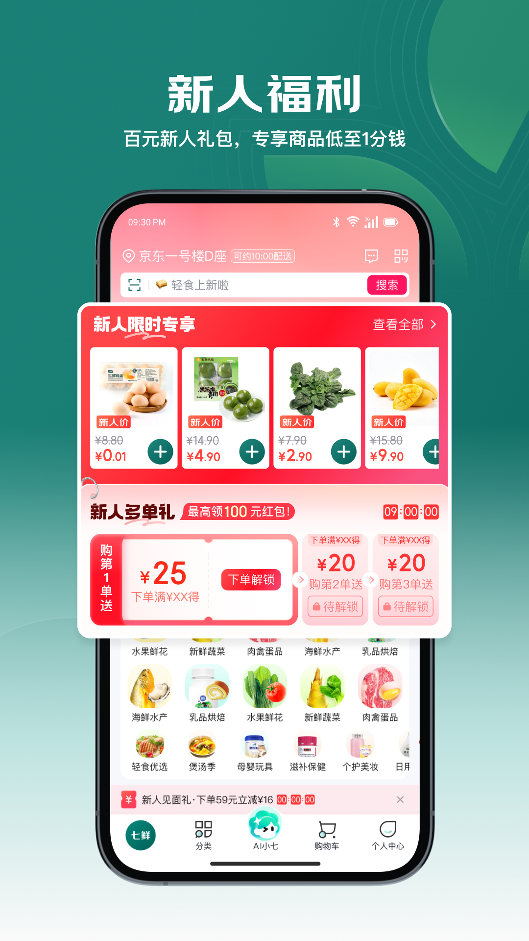 七鲜是京东旗下自营超市。在线下开设近百家实体门店,覆盖北京、上海、广州等核心城市,品质看得见;线上通过APP下单,门店同款商品速达您家,新鲜无需等待。<br>【新人福利,多重好礼】<br>百元新人券包,首单更享免运费特权。<br>新人专享价商品,低至1分钱。<br>【够多,一站式生活全搞定】<br>果蔬肉蛋、活鲜水产、烘焙熟食、米面粮油等,从基础食材到品质好物,全品类覆盖,满足全家日常所需,下厨灵感一站集齐。<br>【够新,时令美味抢鲜尝】<br>春季时令鲜蔬、网红新品、季节限定好物密集上新,跟着节气吃,餐桌天天不重样,抢先体验舌尖上的新鲜感。<br>【够鲜,鲜活品质极速达】<br>24小时菜:从产地到货架不超过24小时,锁住鲜嫩本味。<br>吊水鱼:10天活水净化,肉质紧实,告别土腥味。<br><br>线下门店遍布全国多城,品质看得见、摸得着。<br>APP下单,速达您家,美味新鲜直抵餐桌。