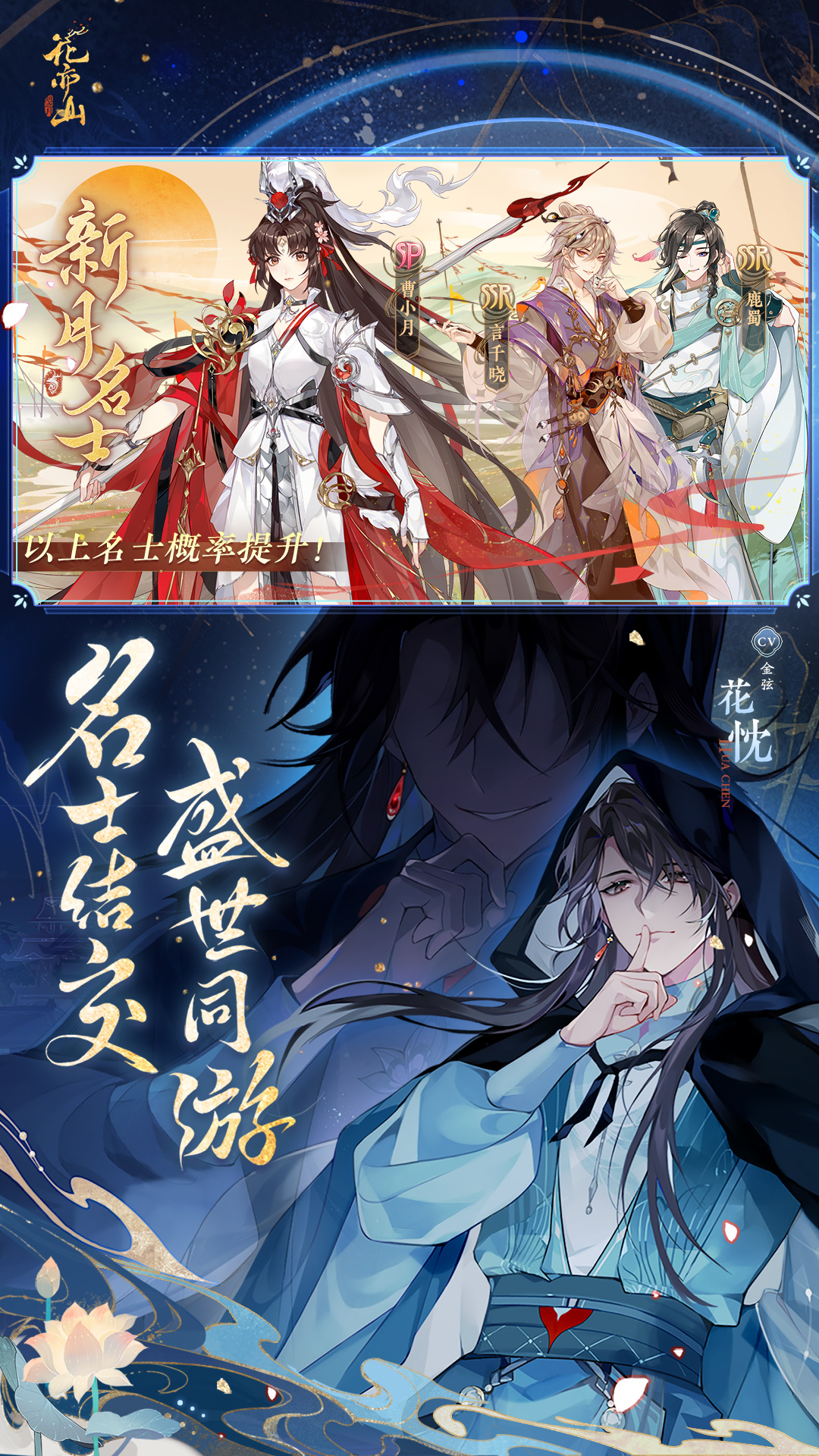 《花亦山心之月》是一款由朝夕光年自研的国风权谋群像养成手游。游戏以独特的颜彩描金画风,绘出一个古雅华贵的东方盛世;并特邀吴磊、苏尚卿等知名声优配音,国风音乐大师林海配乐,共同营造极致沉浸的声画体验。身为花家少主的“你”将结识各色名冠天下的卓绝之士,一同在皇家书院修习,体验雅致的书院生活;也将奔赴于朝堂,以权谋搅动天下风云,在乱世的漩涡中找寻治世之道,感受无尽人心…… 【名士结交,盛世同游】 是杀伐决断的首辅,也是思想深邃的先驱; 是万人敬仰的亲王,却满怀无人理解的孤寂;世人皆说大公主气盛专强,又有谁曾得见其情纯真……与各色名士缔结盟约,解锁TA不为人知的故事,感受其中的粼粼波光与惊涛骇浪。 【权谋爽剧,风云迭起】 从皇家书院的闲适雅致,到朝堂之上的波谲云诡,看似平静的大景早已暗潮涌动,你能否在世家纷争的漩涡中找到治世之道?头顶风云变幻,脚下步步惊心。这一路,有明枪暗箭,更有惺惺相惜。 【颜彩金描,国风巨制】 以中国传统色绘制东方的古典神韵,以描金工艺勾勒盛世的雅致华贵。飞檐斗拱的亭台楼宇、恢弘壮丽的宫殿建筑,一展宣景的盛世气度;其间的岸柳飞花、碧空流云,尽显国风的无限意境。 【豪华声优,视听盛宴】 游戏特邀吴磊、苏尚卿、杨梦露、陶典等顶级声优倾情献声,殿堂级国风音乐大师林海配乐,在耳端构筑纷纭世界,以听觉呈现人物悲欢,营造极致沉浸的声画体验。 【美妆华服,互动休闲】 点朱唇、贴花钿,自由捏脸国风美妆。理袖带、弄金钗,华服万千随心搭配。还可品茶会友,行飞花令,打理花圃,在紧张刺激的权谋斗争之余,悠享惬意的闲适时光。