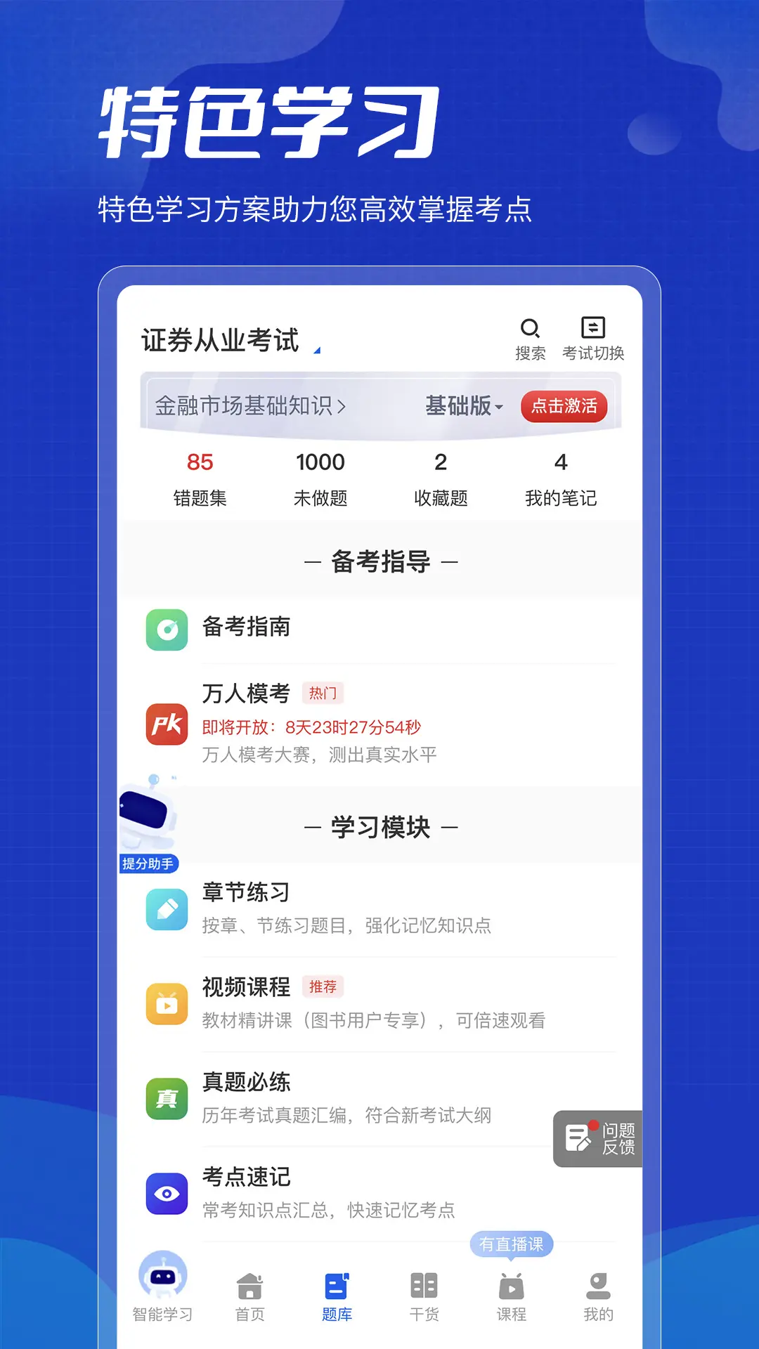得分未来,提供了学习互动群、知识点刷题、模块刷题、历年套卷及模考估分等功能。 【功能特色】 1、学习互动群,在问答交流中持续进步; 2、与考情相匹配的个性化刷题,练习即是模拟考试; 3、真题模考估分,详细的试卷报告,精准分析考情;